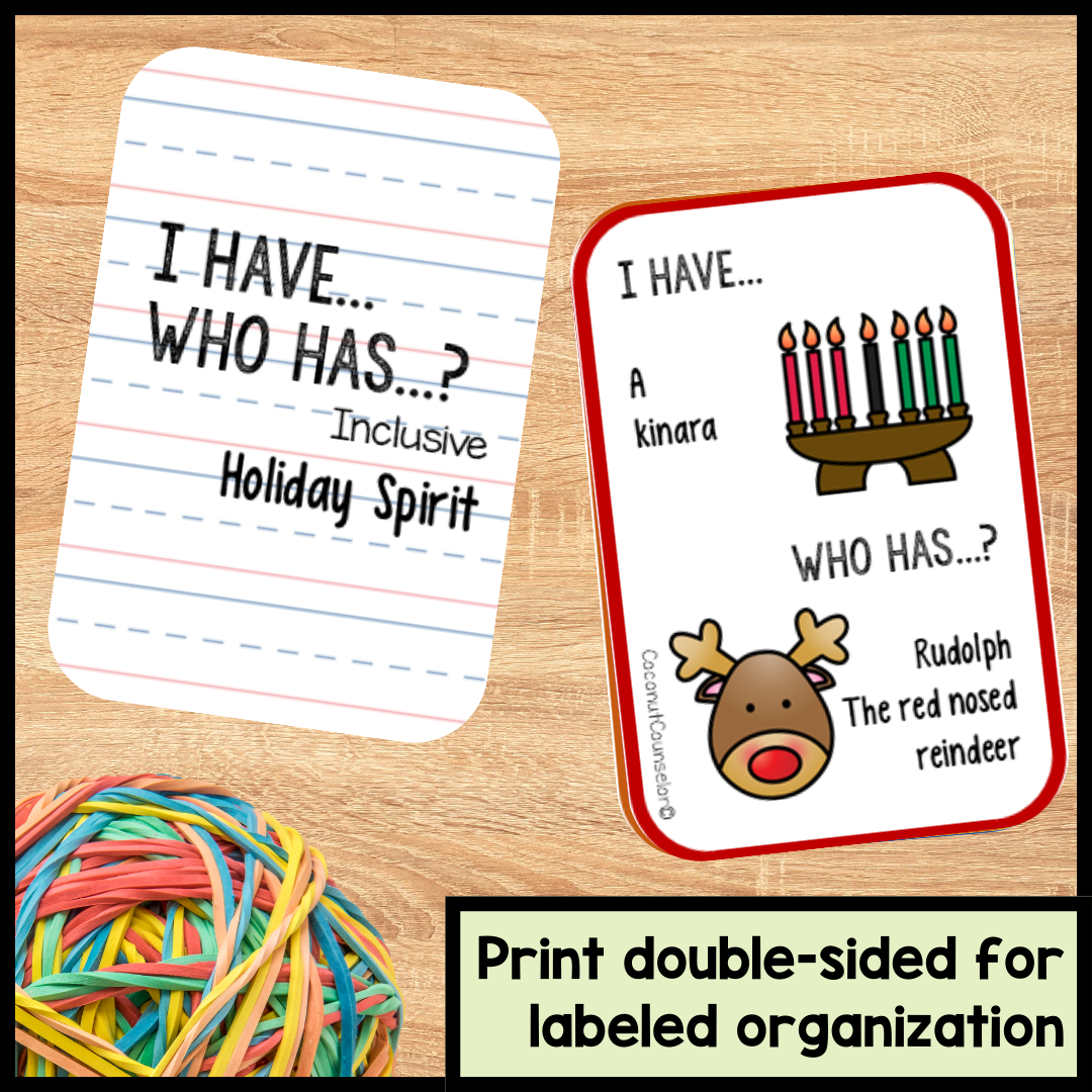 This Inclusive Holiday Spirit "I have… Who has...?" Card Game is great for generating ideas about how to diversify celebrating the holiday season. Includes 24 playing cards. Use as a group warm up activity in a social emotional learning or school counseling classroom lesson. Suitable for students 2nd-8th.